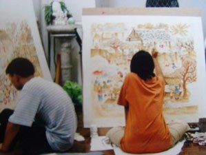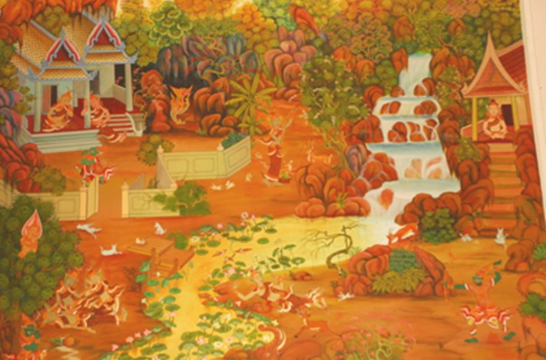 จิตรกรรมฝาผนัง ฝีมือครูจูหลิง ปงกันมูล แสดงเรื่องราวพุทธประวัติบน