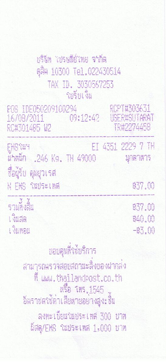 คุณยุวเรศ > EI 4352 2227 TH ส่งสินค้าให้เมื่อวานตอนเช้าเรียบร้อยแล้วนะคะ โอกาศหน้าเชิญเลือกชื้อสินค้าเครื่องสำอางเกาหลีคุณภาพของแท้จากร้านของเราได้อีกนะคะขอบคุณมากๆค่ะ