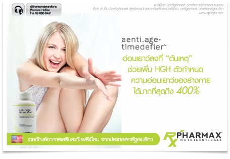 · เวชภัณฑ์อาหารเสริมเกรดการแพทย์ Pharmax aenti.age timedefier จากประเทศสหรัฐอเมริกา เป็นสารตั้งต้นการหลั่ง HGH อย่างเป็นธรรมชาติ เพื่อป้องกันและชะลอการเสื่อมของร่างกาย ใช้ได้กับผู้หญิงทุกคนที่มีอายุเกิน 20 ปีขึ้นไป ซึ่งจะมีระดับของ HGH ที่ลดลงอย่างมีนัยสำคัญ ช่วยชะลอการเสื่อมของร่างกาย ทำให้หลับได้ลึกขึ้น มีความรู้สึกกระปรี้กระเปร่าขึ้น มีริ้วรอยน้อยลง ไม่สบายได้ยากขึ้น และแลดูอ่อนเยาว์ลง