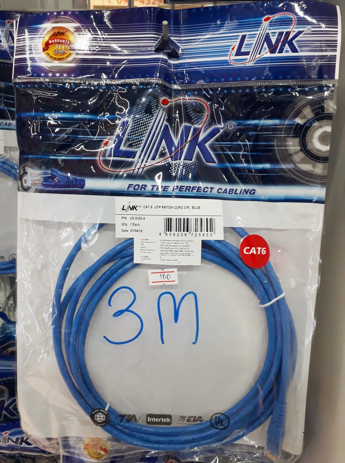 LINK US-5103-4 CAT6 RJ45-RJ45 Patch Cord ความยาว 3 เมตร/สีน้ำเงิน