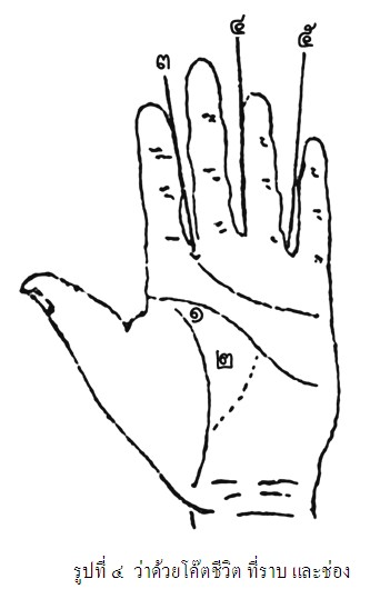 หมายเลข ๔ คือช่องนิ้วมือระหว่างนิ้วกลางกับนิ้วนาง ช่องนี้เขาเรียกว่า