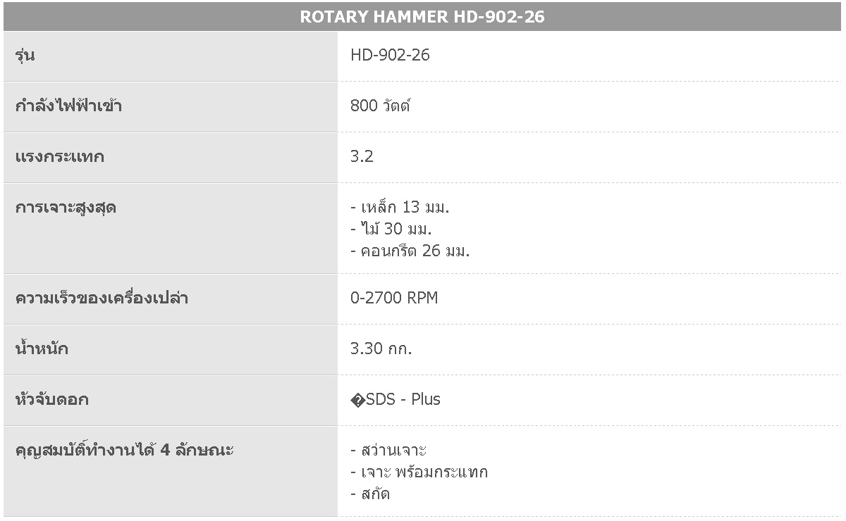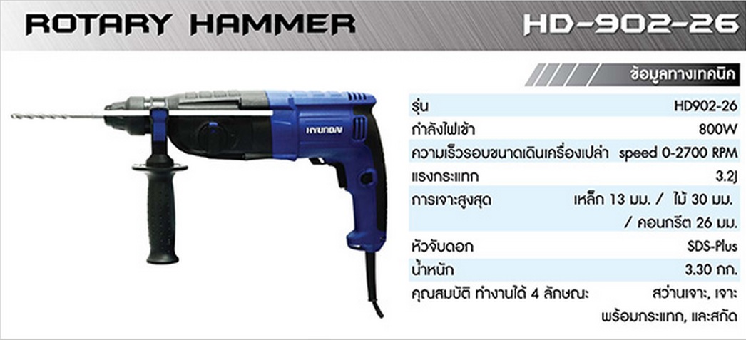 สว่านไฟฟ้า 3 ระบบ รุ่น HD-906-26 ฮุนได Hyundai กำลังไฟ 800 วัตต์ ความเร็วรอบ 0-2700 rpm. แรงกระแทก 3.2j การเจาะสูงสุด เหล็ก 13 มม. /ไม้ 30 มม./ คอนกรีต 26 มม. หัวจับ SDS-Plus