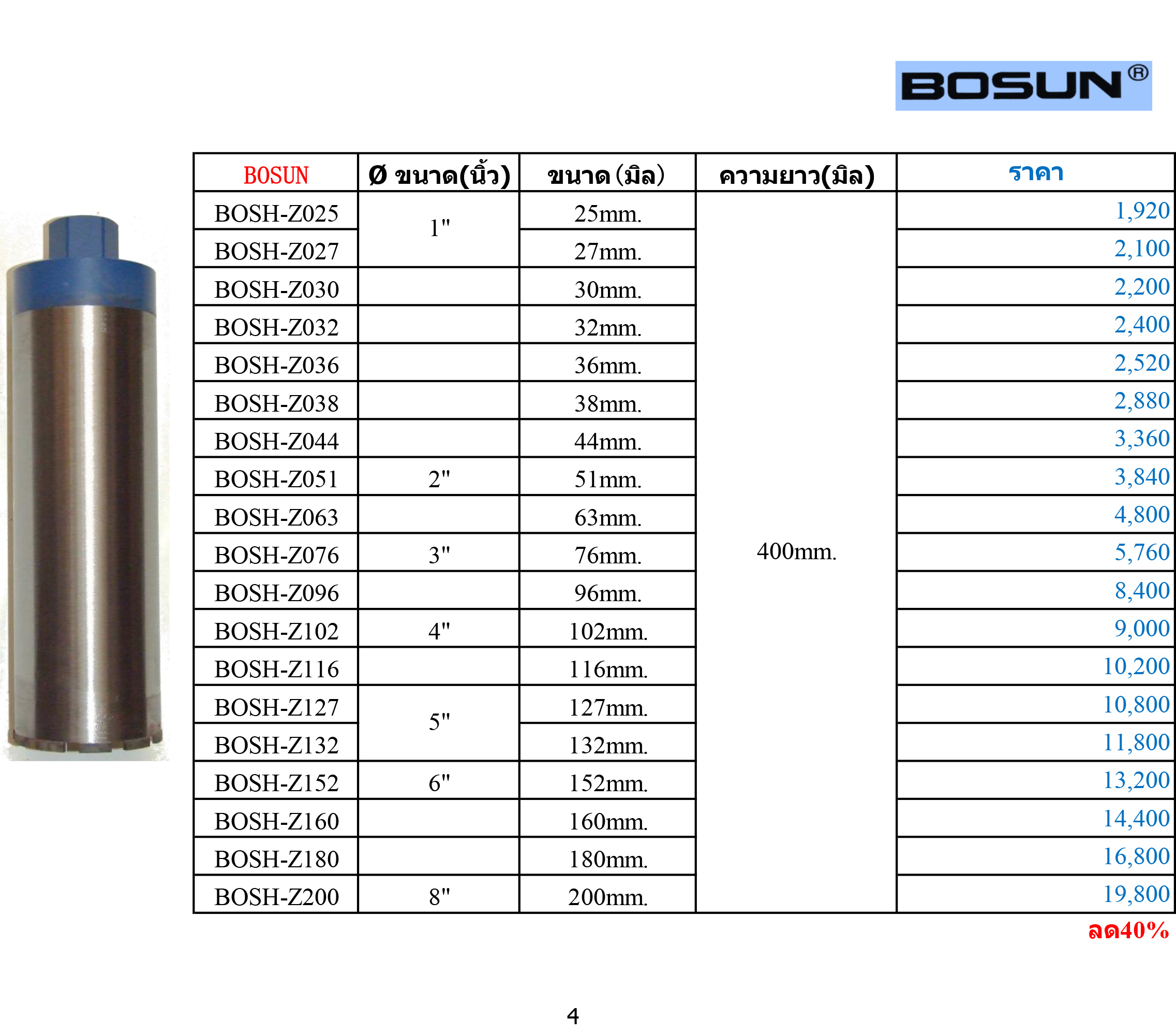 กระบอกเจาะหัวเพชร สำหรับเครื่องเจาะคอนกรีต (Diamond core bits) Bosun