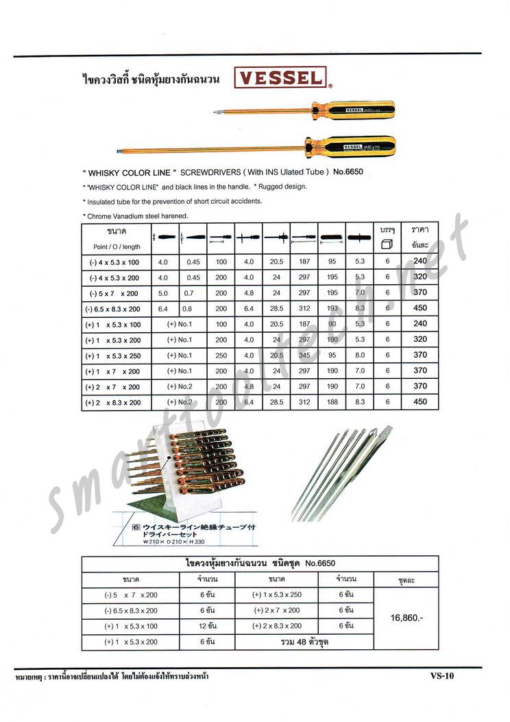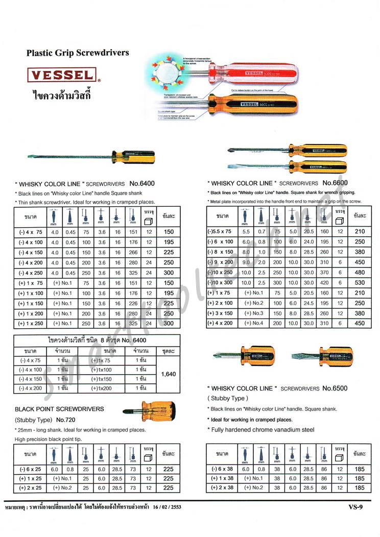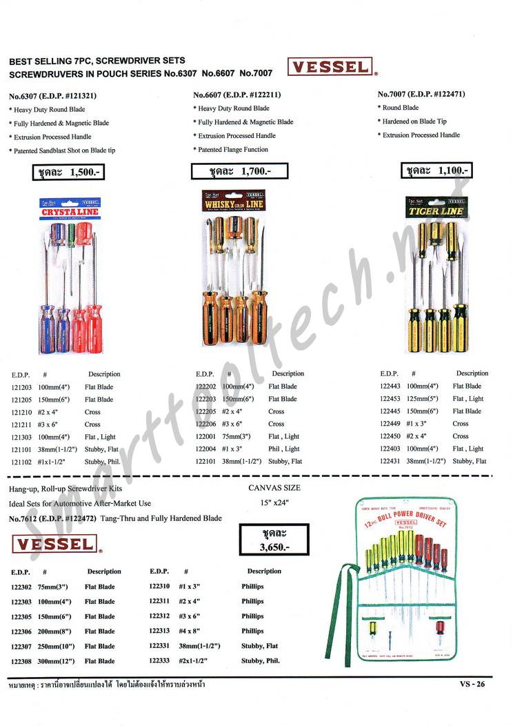 ไขควงVESSEL เป็นไขควงที่มีคุณภาพอันดับต้นๆของญี่ปุ่น แม้ว่าบางรุ่นจะย้ายฐานการผลิตไปยังประเทศอื่นเพื่อลดต้นทุน แต่ก็ยังคงรักษาคุณภาพมาตรฐานของไขควง VESSEL ไว้ได้เป็นอย่างดี และมีสินค้าให้เลือกใช้มากมายหลายชนิดไม่ว่าจะเป็น ไขควงด้ามยาง ไขควงตอก ไขควงกระแทก ไขควงลม ดอกไขควง ไขควงชุด หรือแม้แต่ ไขควงเช็คไฟ ท่านสามารถดูรายละเอียดสินค้าของไขควง VESSEL ได้ตาม Link ด้านล่าง หรือติดต่อทีมงาน Smarttooltech หากมีข้อสงสัยเพิ่มเติม