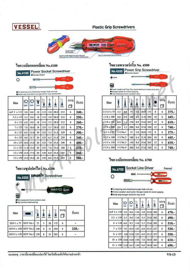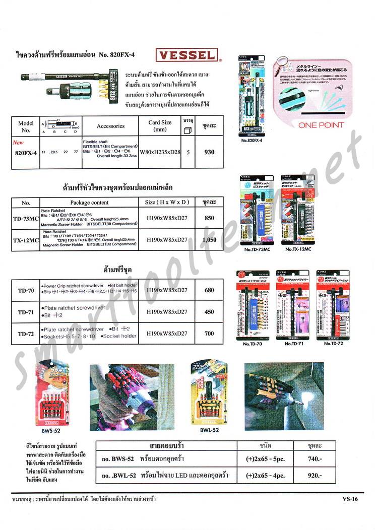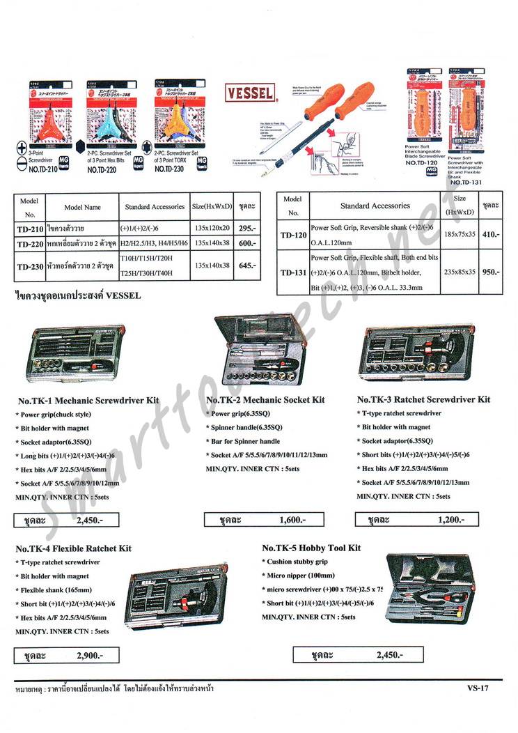 อีเมลล์: smarttooltech@gmail.comไขควงVESSEL เป็นไขควงที่มีคุณภาพอันดับต้นๆของญี่ปุ่น แม้ว่าบางรุ่นจะย้ายฐานการผลิตไปยังประเทศอื่นเพื่อลดต้นทุน แต่ก็ยังคงรักษาคุณภาพมาตรฐานของไขควง VESSEL ไว้ได้เป็นอย่างดี และมีสินค้าให้เลือกใช้มากมายหลายชนิดไม่ว่าจะเป็น ไขควงด้ามยาง ไขควงตอก ไขควงกระแทก ไขควงลม ดอกไขควง ไขควงชุด หรือแม้แต่ ไขควงเช็คไฟ ท่านสามารถดูรายละเอียดสินค้าของไขควง VESSEL ได้ตาม Link ด้านล่าง หรือติดต่อทีมงาน Smarttooltech หากมีข้อสงสัยเพิ่มเติม