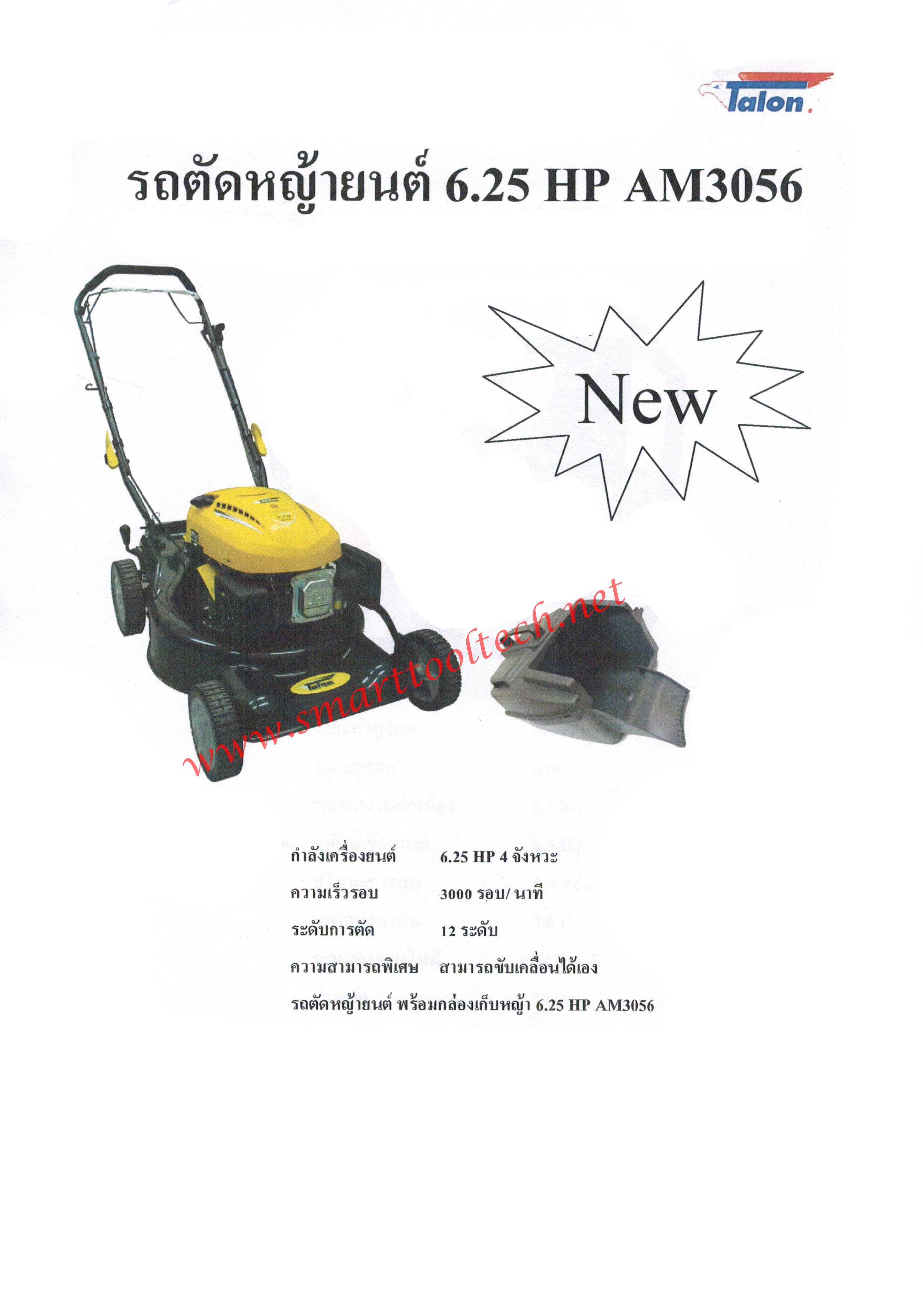 เครื่องตัดหญ้ารถเข็น เครื่องยนต์ 6.25 HP. 4 จังหวะ สามารถปรับระดับได้ถึง 12 ระดับ ความเร็วรอบ 3000 รอบ/นาที มาพร้อมกล่องเก็บหญ้า รุ่น AM3056 TALON
