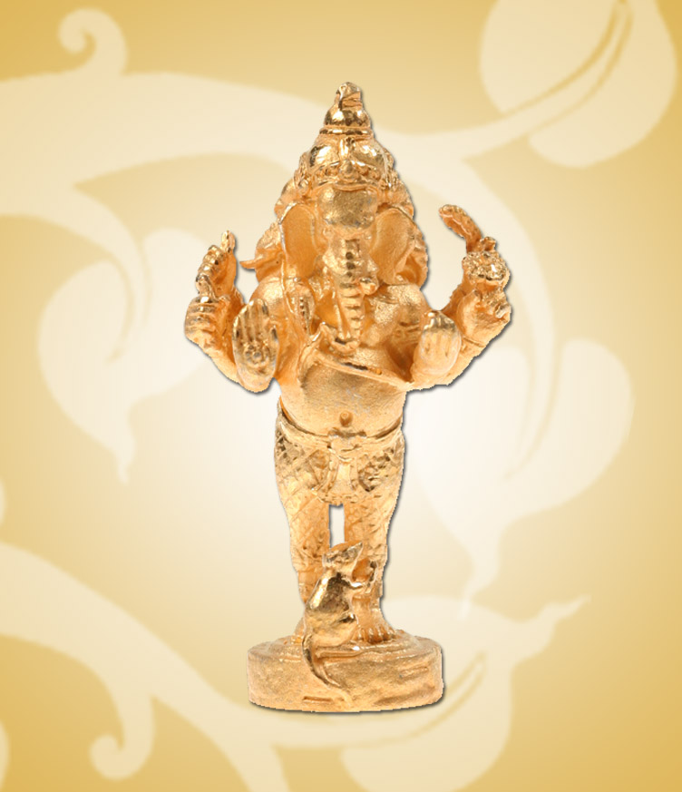 พระพิฆเนศปางยืน องค์เล็กสีทอง เลี่ยมกรอบทองเหลืองพร้อมแหนบสแตนด์เสล