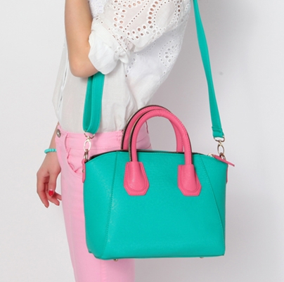 รุ่นนี้ดูน่ารัก ดีไซน์ได้ลงตัวเอามากๆ ตัวกระเป๋าสีเขียว เล่นหูกระเป๋า และตกแต่งด้วยสีชมพู หูกระเป๋ามีซิบตกแต่งเก๋มาก ทรงสวย ก้นกระเป๋าแข็งแรง ใช้ได้หลายๆ โอกาส เหมาะทั้งสาววัยรุ่น วัยทำงาน สีสายสะพายให้ด้วยค่ะ ราคาปลีก 7