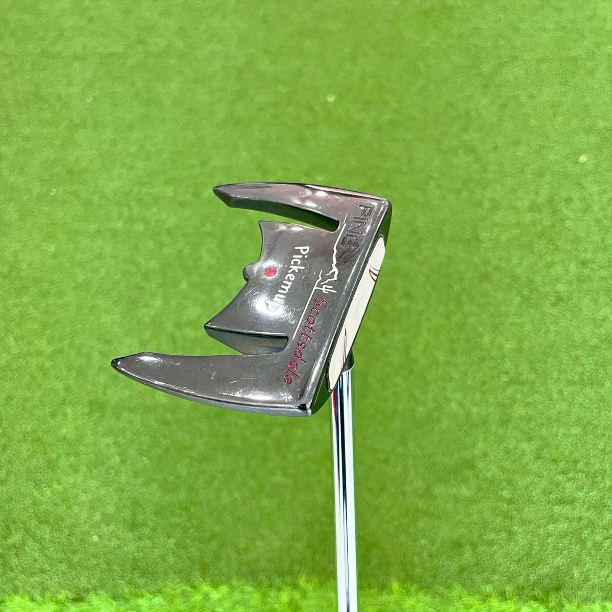 PUTTER PING SCOTTSDALE PICKEMUP 34inch ก้านเหล็กผสมก้าน TOUR AD DI-6 S พัตต์รุ่นนี้ที่มีก้านอยู่ตรงกลางจะดึงดูดผู้เล่นที่ตั้งท่าได้สบายกว่าเมื่อไม่มีออฟเซ็ต และมีลักษณะการพัตต์แบบตรง การถ่วงน้ำหนักที่ส้นและปลายก้านช่วยเพิ่มความเสถียร ทำให้มีค่า MOI สูง