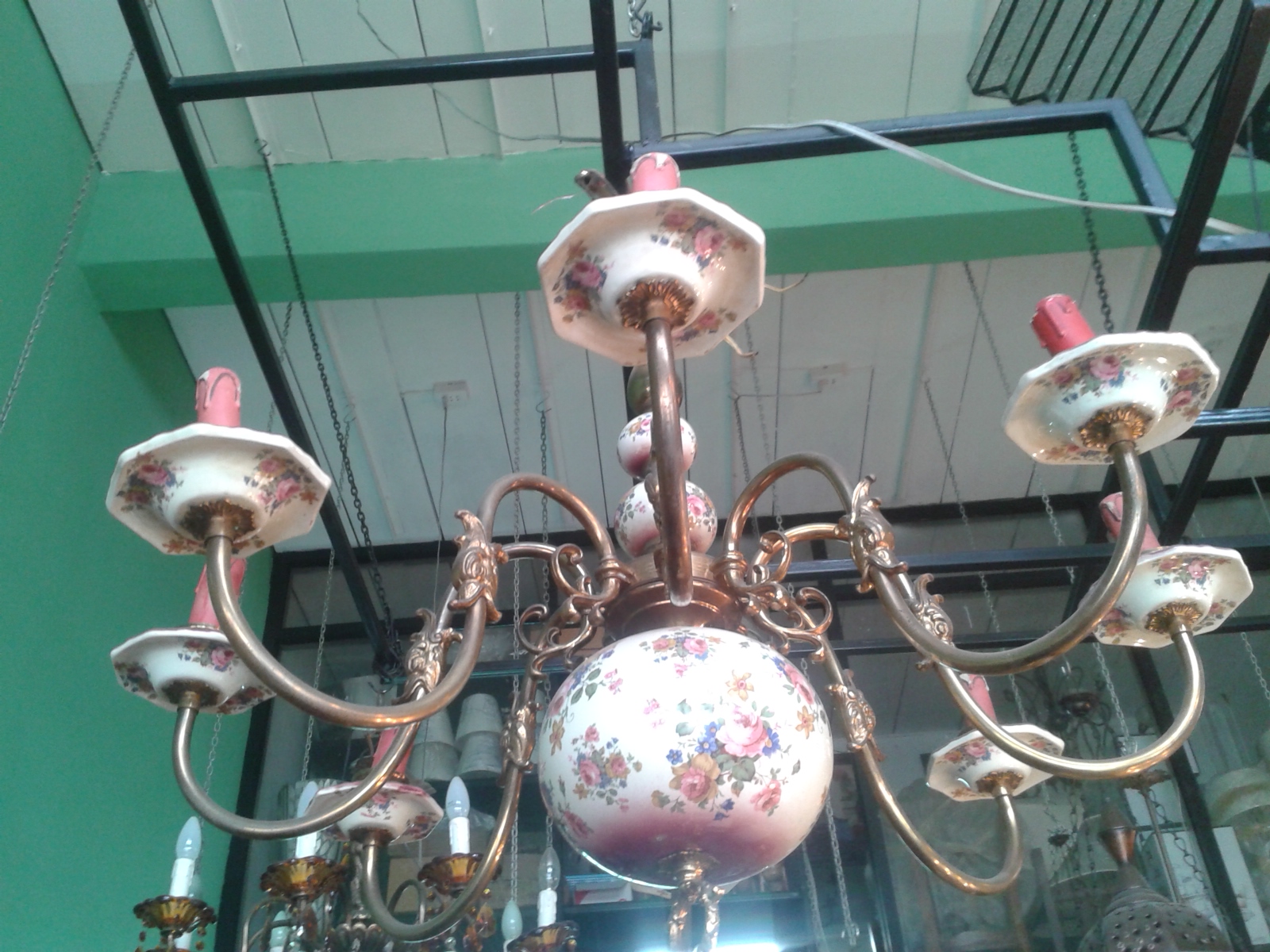 โคมไฟกระเบื้องเก่า สีชมพูลายดอกไม้แขนทองเหลือง 8แขน นำเข้าจากเยอรมัน สนใจโทรสอบถามได้ที่ 02 570 1987 ฝ่ายขาย 061 509 5337,065 551 5945