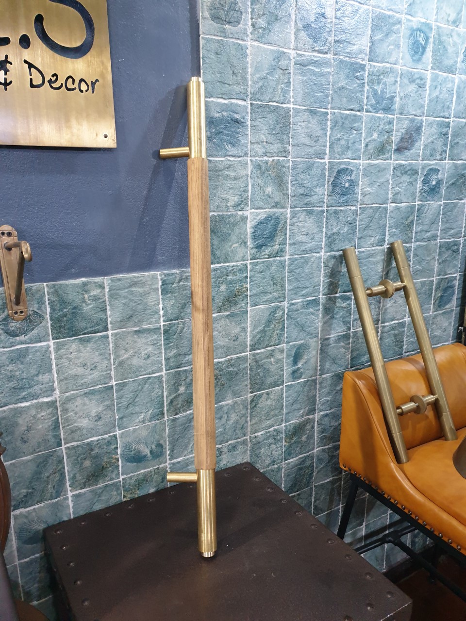 Brass door handle brass with teakwood Item Code AC90W size long 900 mm brass shoe L 120 mm. Wood 40